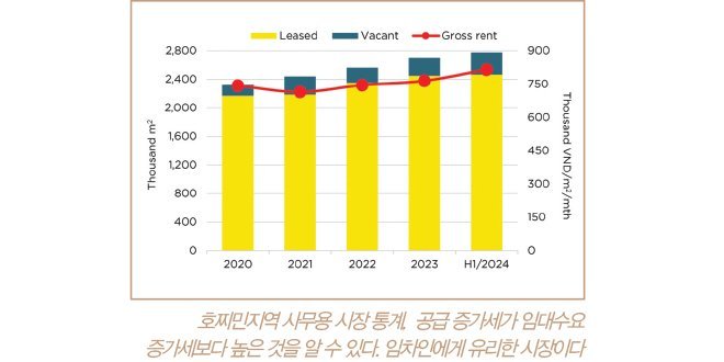 호찌민시의 A등급 교외 오피스 부문(최소 15층 이상의 사무용 건물)은 2024년 2분기에 공급과 수요 측면에서 균형을 이루는 성과를 보였다. 임대료는 월 평당 815,000동으로 상승했으며, 이는 전분기 대비 2%, 전년 동기 대비 8% 상승한 수치다. 점유율은 84%로 증가했다. 호찌민시의 오피스 시장은 계속해서 베트남에 투자하고자 하는 외국 및 국내 기업의 강한 관심을 끌고 있다. 지속적인 개발 계획과 더불어 건전한 거시경제 상황을 고려할 때, 호찌민시 사무용 부동산의 전망은 밝다고 볼 수 있다.