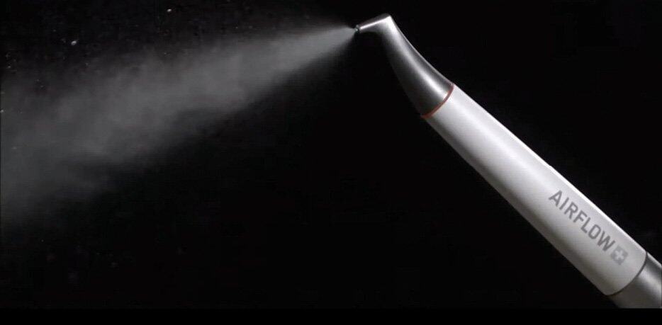 [사진 1]: EMS 사의 Airflow 핸드피스에서 물과 마이크로 파우더가 함께 분사되고 있다