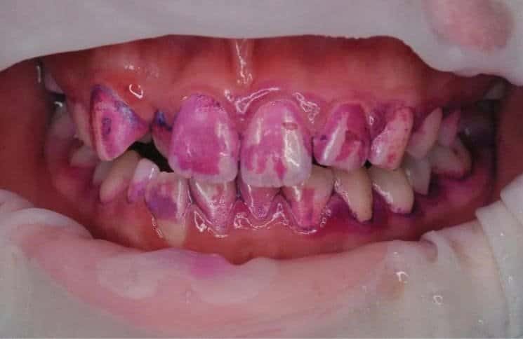 [그림 2] : GBT 염색약을 통해서 치태의 위치를 표시한 상태. 생각보다 많은 치태가 치면에 침착되어있음을 알 수 있다.