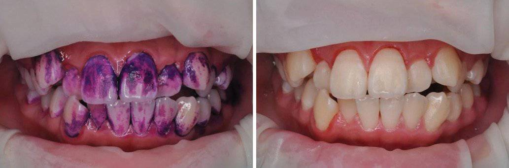 + 바이오필름 제거에 집중: GBT는 치아와 잇몸에 쌓인 바이오필름(치태)을 제거하는 데 중점을 둡니다. 염색제를 사용해 치태를 시각적으로 확인한 후, 이를 정밀하게 제거하는 과정을 통해 진단과 치료의 정확도를 높입니다(그림 2)