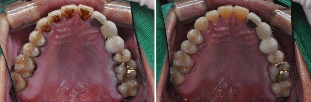 저희 치과에 방문해주는 소아부터 청소년 친구들 중에 가끔 양치를 잘 하려고 노력하지만 잘 안되거나 혹은 잘 안 닦이고 있는 사실을 모르고 있는 친구들이 있습니다. 소아청소년기에는 치아가 아직 경화가 덜 되어서 충치에 매우 취약할 수 있습니다. 단단하게 붙은 치태와 치석을 GBT를 통해서 치료해서 환자들에게 현상태 파악과 양치질의 중요성을 전달해줄 수 있으며, 무엇보다 충치를 예방해줄 수 있다는 사실은 매우 강점으로보입니다.(그림 3). 또한 성인 환자분들 중에서 흡연과 커피 소비에 의한 착색은 쉽게 지워지지가 않습니다. 이런 환자분들께는 특히나 환한 인상을 줄 수 있는 GBT를 적극 권해드립니다(그림 4).