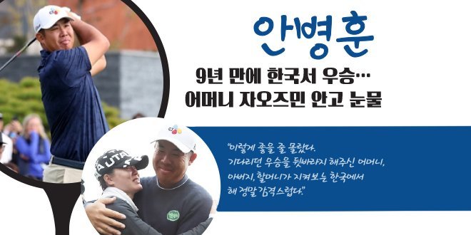 안병훈(33)은 18번 홀(파5) 그린 옆에서 기다리던 어머니 자오즈민(61)을 꼭 안고 눈물을 흘렸다. 어머니도 “자랑스럽다. 멋진 경기였다”고 아들을 칭찬하고는 함께 울었다. 안병훈이 27일 인천 송도 잭 니클라우스 코리아 골프클럽(파72)에서 열린 DP월드투어 제네시스 챔피언십(총상금 400만달러) 최종일 연장전에서 김주형(22)을 제치고 우승했다. 우승 상금은 68만달러(약 9억5000만원). 이 대회는 DP월드투어와 한국프로골프(KPGA) 투어가 공동 주관했다.