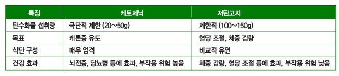 이에 비하여 저탄고지 식단은 보다 유연한 접근 방식으로 탄소화물 비중을 여유있게 잡아 체중 감량과 건강 개선을 추구한다는 점에서 약간의 차이가 있지만 식단의 유형은 동일하다고 볼 수 있습니다. 굳이 구분하는 이유는 적용하는 인체의 유형이 따라 그 목적이 다를 수 있다는 점에서 분류하는 듯합니다. 이글에서는 혼합되어 함께 사용되는 경우가 많습니다.