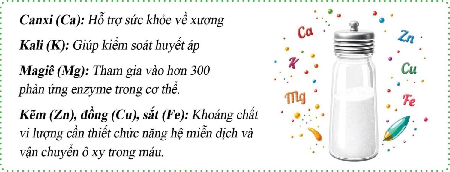 Ngoài natri, một số loại muối còn chứa các khoáng chất mang lại nhiều lợi ích sức khỏe như: