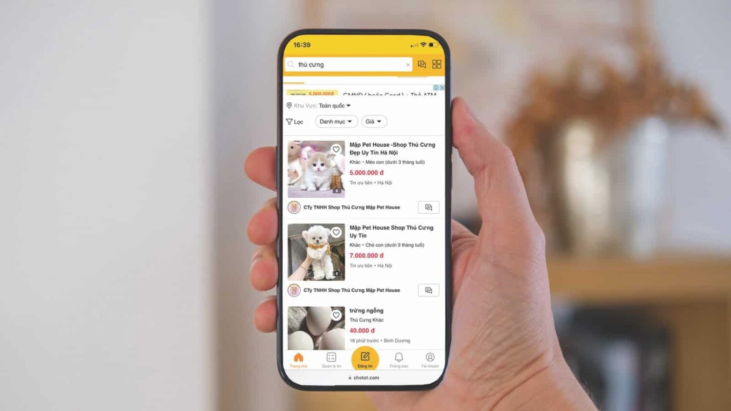또 다른 방법은 베트남의 대표적인 중고거래 사이트인 ‘쩌똣(Cho Tot)’을 이용하는 것이다. 이 사이트에서는 ‘Thú cưng’ 카테고리를 통해 다양한 반려동물 입양 정보를 확인할 수 있다.