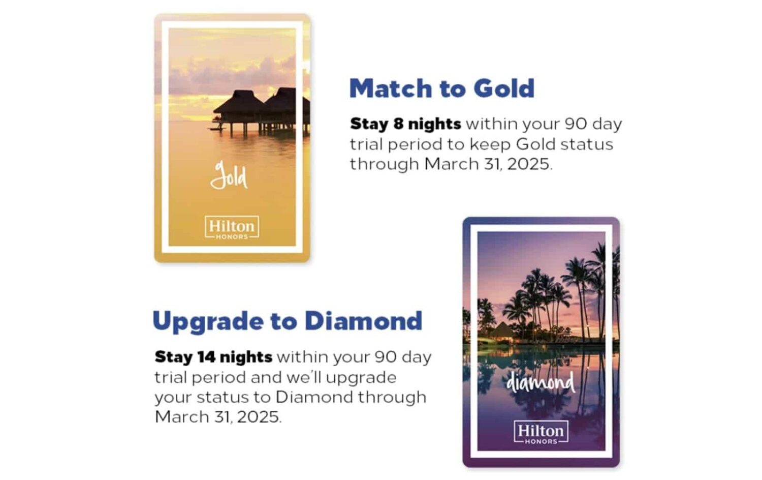 힐튼은 티어 매칭 제도를 통해(단 1회만 가능) 90일 동안 임시로 ‘Gold Elite’ 등급을 부여한다. 이 기간 중 7박 투숙 시 ‘Gold Elite’, 12박 투숙 시 ‘Diamond Elite’ 등급을 정식으로 획득할 수 있다. 힐튼은 ‘더블 스테이(Double Stay)’ 프로모션을 자주 진행해 1박 투숙이 2박으로 계산되는 혜택을 제공하기도 한다.