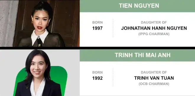 오리엔트 상업은행(Orient Commercial Joint Stock Bank) 부회장은 회장 찐 반 뚜안(Trinh Van Tuan)의 딸인 찐 티 마이 안(Trinh Thi Mai Anh)으로, 약 4,690억 동 상당의 지분을 보유하고 있다.