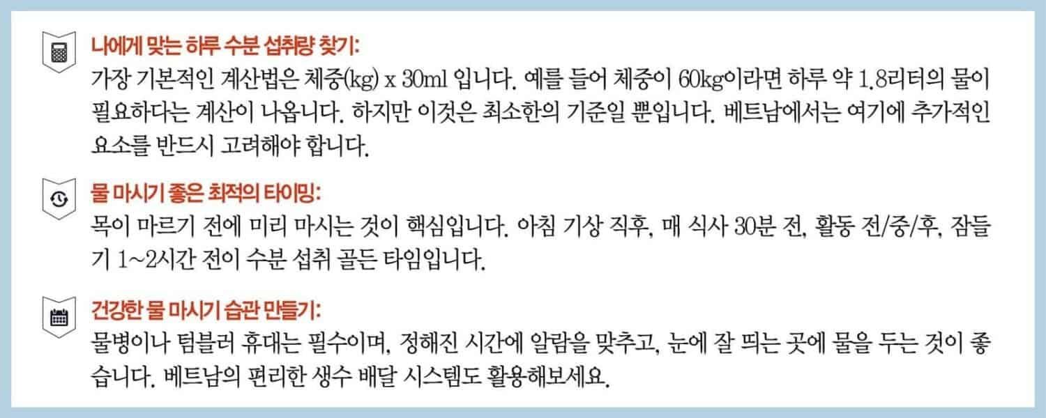 지금까지 우리는 찌는 듯한 더위와 높은 습도가 일상인 베트남에서 건강을 지키기 위한 가장 기본적이면서도 중요한 전략, 바로 ‘똑똑한 수분 섭취’에 대해 자세히 알아보았습니다.