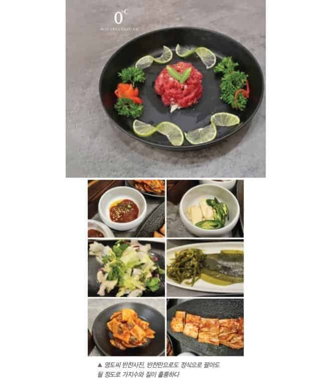 반찬 구성에서도 0oC만의 특별함이 엿보인다. 기본 상차림으로 제공되는 육회와 양념게장은 단순한 곁들임 음식이 아닌, 메인 요리에 버금가는 퀄리티를 자랑한다. 각종 김치류와 함께 제공되는 반찬들은 하나하나 정성을 들인 맛을 보여주며, 단순히 가짓수를 채우기 위한 형식적인 구성이 아닌 실질적인 맛을 추구한다는 점이 돋보인다. 특히 이곳에서는 한국에서도 보디 드문 어리굴젓과 갈치젓을 직접 만들어서 제공하며, 양념게장도 반찬으로 제공한다는 점에서 손님에게 극한의 가성비를 제공할려는 노력이 돋보인다.