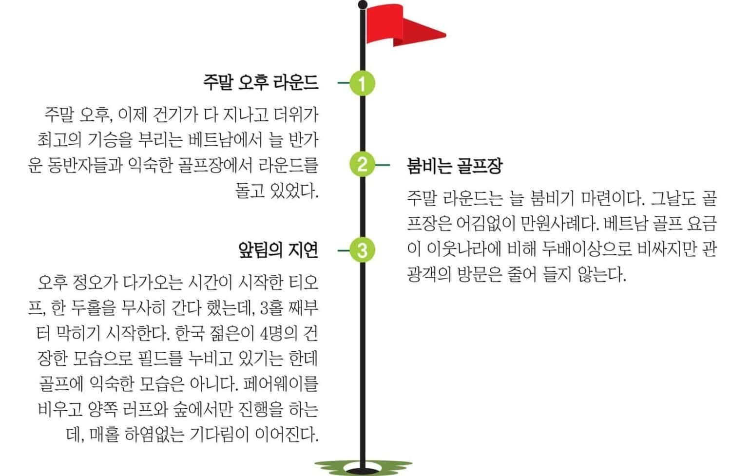 여름철의 골프는 만만치 않은 일이다. 더욱이 늘 여름나라인 베트남에서는 더욱 그렇다. 한국과는 달리 늘 푸른 잔디 위에 한가롭게 늘어진 야자수 사이에 보이는 정갈한 그린은 사진으로 보면 더없이 멋지지만 사진으로 나타나지 않는 무더위를 보태면 상황은 완전히 달라진다.