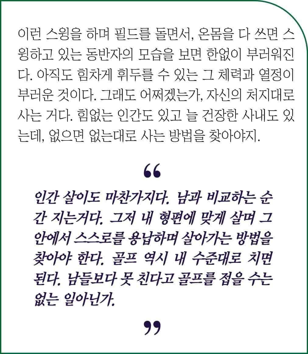 자족하며 살아가는 사람이 자신의 인생을 즐기는 것이려니 하며 오늘도 중력에 의존하는 스윙으로 한발씩 그린으로 무소의 뿔처럼 다가서 보자.