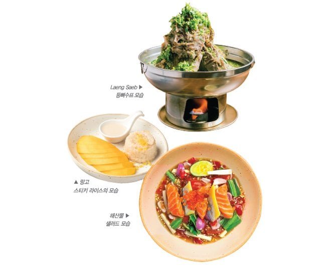 Laeng Saeb, 돼지 등뼈 수프는 이곳의 시그니쳐 메뉴중 하나다. 부드럽게 끓인 돼지 등뼈에 태국 특유의 향신료가 어우러진 이 수프는 풍부한 맛과 깊은 감칠맛으로 많은 고객들의 사랑을 받고 있다. 특히 양이 많아서 한냄비에 2명이 먹어도 남아돌 정도의 가성비를 보여주는데다가 요즘 태국에서 유행하는 음식을 베트남에서도 선보여서 인기가 높다.
