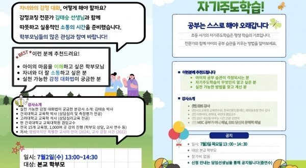 학부모연수는 내달 2∼3일 자녀의 학습 및 성장 과정을 이해하고 효과적으로 지원할 수 있도록 돕는 강의가 진행된다. 첫날에는 김태승 교사(자녀교육법-아이를 성장시키는 감정대화 123), 3일에는 EBS강사인 강용철 교사(스스로 공부하는 힘, 자기주도학습)가 강의한다.