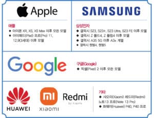 **애플(Apple)**의 경우 아이폰(iPhone) XR, XS, XS Max 이후 모든 모델에서 지원되며,