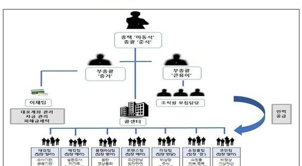 합동수사단에 따르면 보이스피싱 조직은 일명 ‘마동석’으로 불리는 외국인 총책의 대규모 자본을 바탕으로 한국인 부총괄을 통해 지원팀 2개(이체, 모집)와 범죄수행 7개 전문팀 등 총 9개팀의 기업조직과 같은 형태를 갖추고 사기범죄를 벌였다.