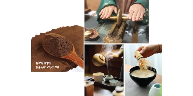 하지만 찻잎은 뜨거운 물 속에서 색이 갈변하기 때문에, 가루를 물에 개서 마시는 형태로 발전했다. 이것이 바로 오늘날 말차의 원형이다. 뜻밖에도 일반적인 잎차보다 역사가 더 오래됐다. 지금 우리가 마시는 잎차는 명나라 시대(1368~1644년)가 되어서야 나타난 양식이다.