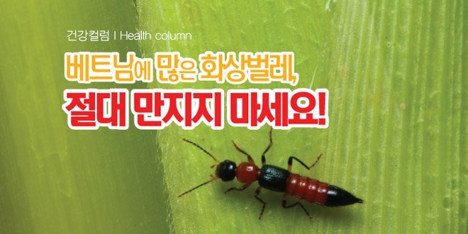 화상벌레는 청딱지개미반날개(Paederus fuscipes)라고 불리는 곤충으로, 화상과 비슷한 염증과 통증을 일으켜 화상벌레라고도 불립니다. 성충의 경우 대략 7~10mm 정도이고 특징적으로 검은색과 주황색 밴드가 교차해서 자리잡고 있습니다. 베트남 전역에 분포하며 낮에는 논과 같은 습지에서 해충을 잡아먹는 익충으로 알려져 있습니다. 주로 밤에 날아다니며 주거지를 옮겨 다닐 수 있는데, 특히 땅거미가 질 때 가장 많이 …