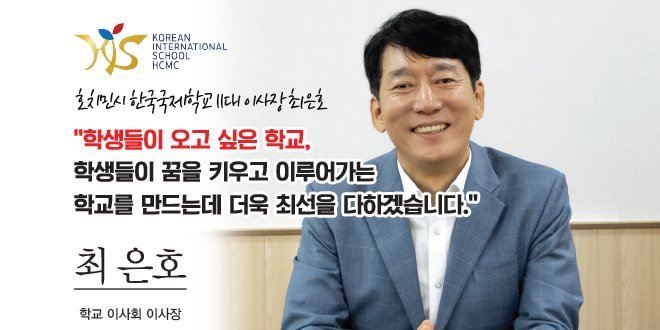 1998년 9월 87명의 학생으로 개교해 이제는 2,000여명 학생의 미래를 위한 배움터이자 글로벌 명문학교로 발돋음해 한-베 미래 인재 양성의 요람이 된 호치민시 한국국제학교.신임 제11대 최은호 이사장을 통해 학교의 과밀 학급문제와 수업료 인상등 현안에 대한 이사회의 입장과 학교 운영에 대한 비전을 들어봤다. 늦었지만 이사장 취임 축하드리며 취임 소감 한마디 부탁드립니다.지난 9월 9일 …